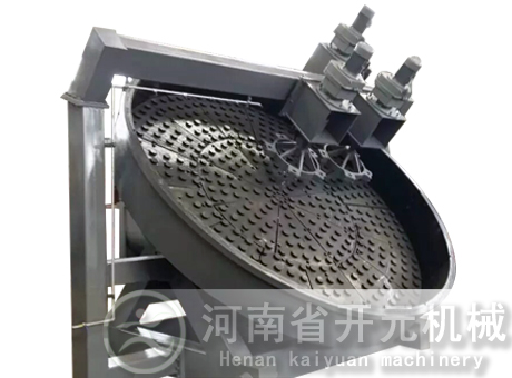 圓盤造粒機是有機肥行業(yè)的常用設備之一,一般適用于中、低濃度,小規(guī)模的生產(chǎn),成球盤調整到40°-55°之間。由電機減速機帶動齒輪從而加入混配好的原料肥。由于粉肥和圓盤旋轉而上升,又在重力的作用下向下滾動,在以上幾種力的作用下,盤內物料逐漸形成基核直至達到成品顆粒,由圓盤邊溢出。本機具有成球率高、顆粒圓潤、強度大、防腐、操作直觀、維修方便等特點。